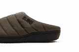 Nylon with water-resistant Teflon coating Polyester down fill Raised inner fabric for unexpected softness Synthetic rubber sole Comes with a drawstring storage bag.